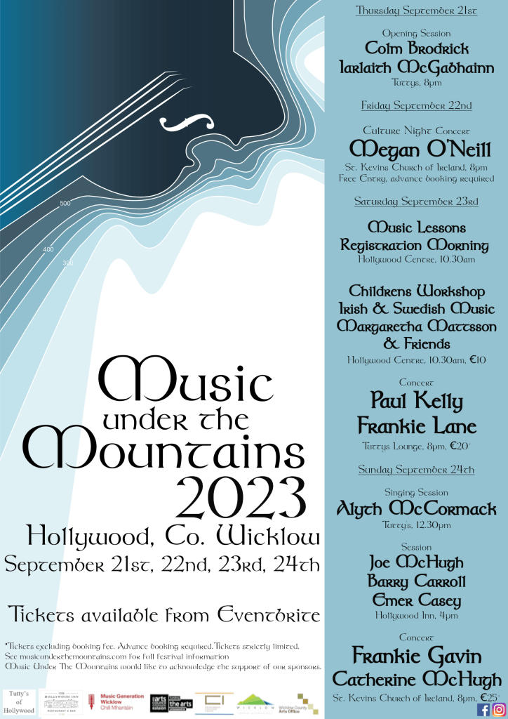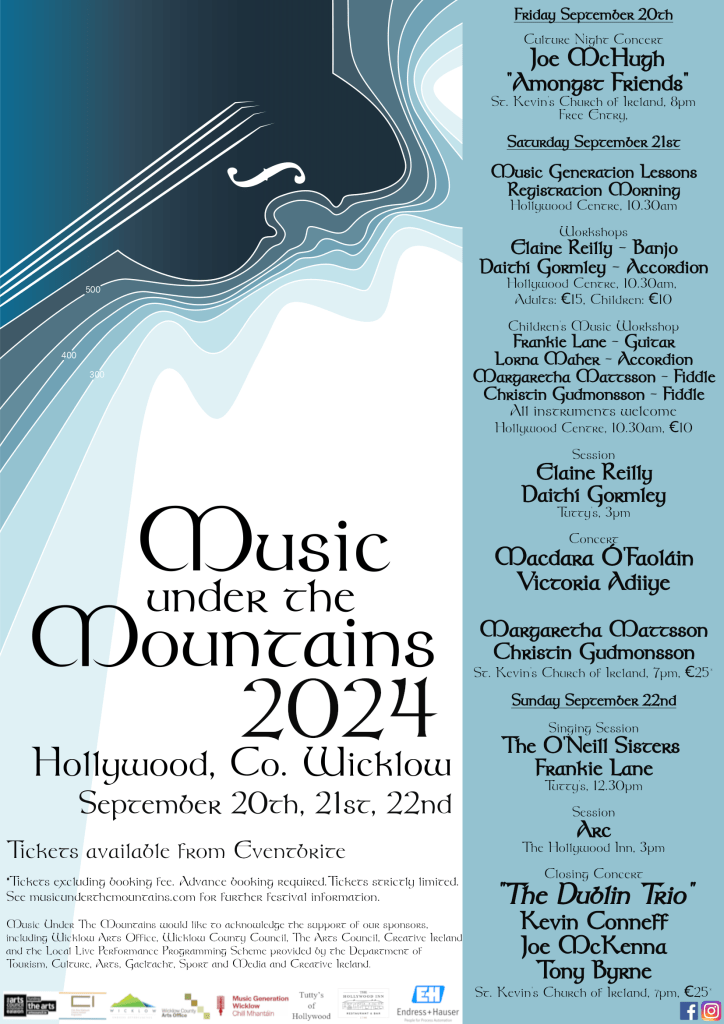 Music Under The Mountains would like to acknowledge the support of our sponsors, including Wicklow Arts Office, Wicklow County Council, The Arts Council, Creative Ireland and the Local Live Performance Programming Scheme provided by the Department of Tourism, Culture, Arts, Gaeltacht, Sport and Media and Creative Ireland Baltinglass Municipal Council Ardenode Stud, Kevin Phelan and all our generous sponsors, without whom the festival would not be possible.