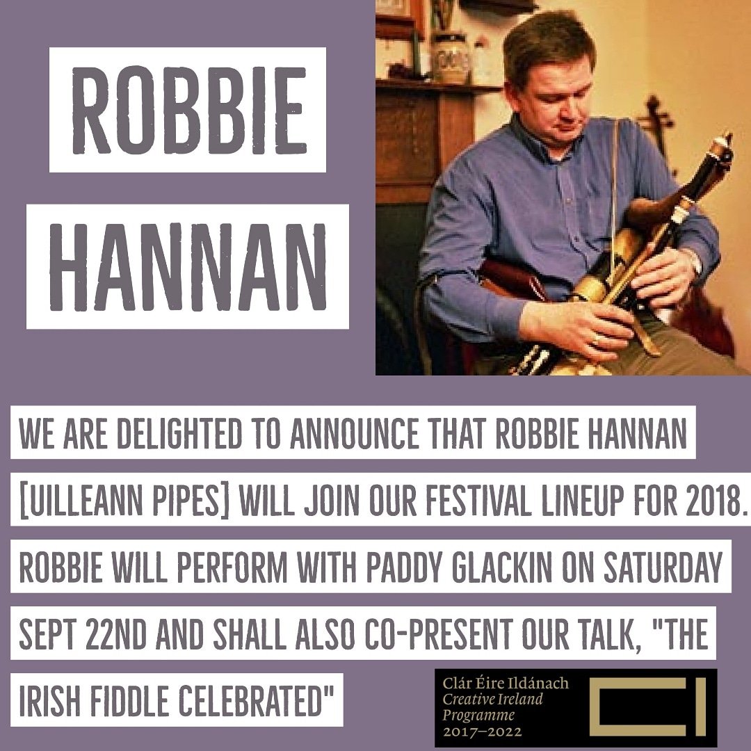 We are delighted to announce that Robbie Hannan (Uilleann Pipes) shall perform on Saturday September 22nd with Paddy Glackin. Robbie has performed with Paddy many times and they have also recorded an album together, “Séideán Sí”.