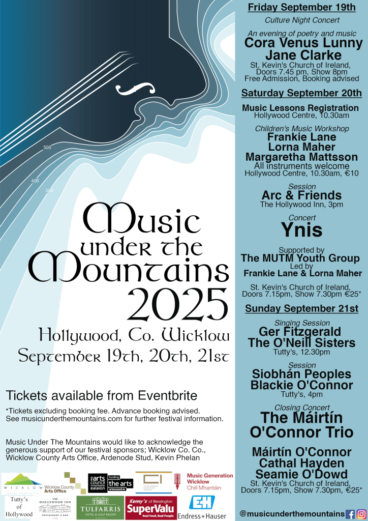 Music Under The Mountains would like to acknowledge the support of our sponsors, including Wicklow Arts Office, Wicklow County Council, The Arts Council, Creative Ireland and the Local Live Performance Programming Scheme provided by the Department of Tourism, Culture, Arts, Gaeltacht, Sport and Media and Creative Ireland Baltinglass Municipal Council Ardenode Stud, Kevin Phelan and all our generous sponsors, without whom the festival would not be possible.